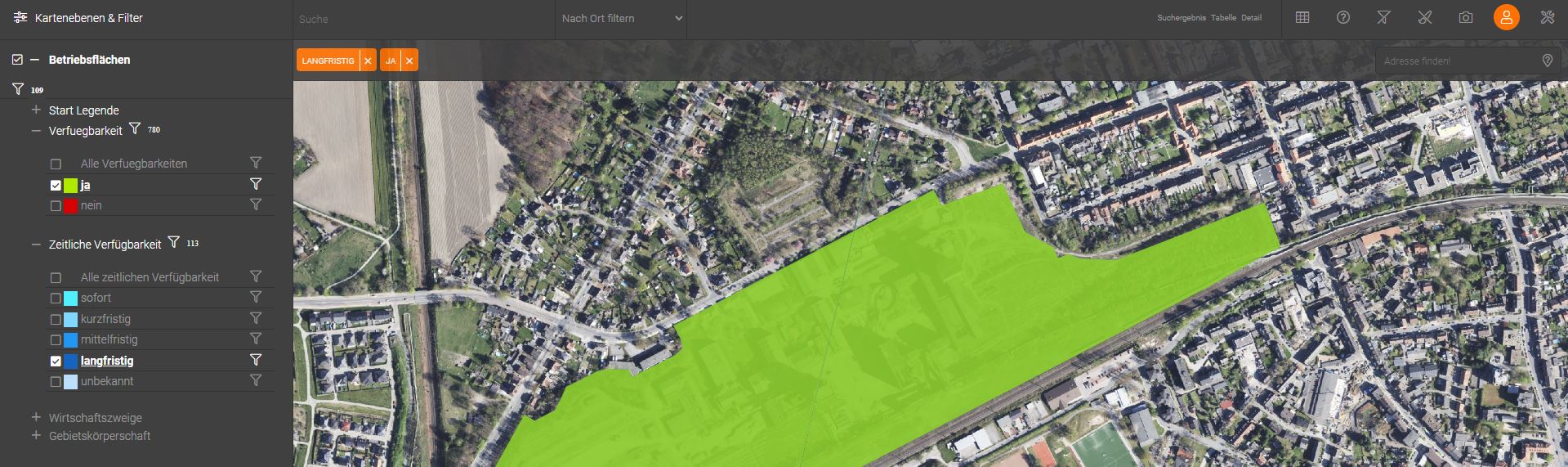 Werden zwei Werte verschiedener Eigenschaften gefiltert, so lässt sich auf einen Blick erkennen, wie viele Elemente pro Eigenschaft gefunden wurden und für wie viele Elemente des Layers beide Eigenschaften zutreffen. In diesem Beispiel besitzen von den Betriebsflächen 780 Verfügbar ja. 113 der Betriebsflächen weisen eine Zeitliche Verfügbarkeit langfristig auf und 109 Betriebsflächen besitzen beide Attribute (siehe Abbildung unten).