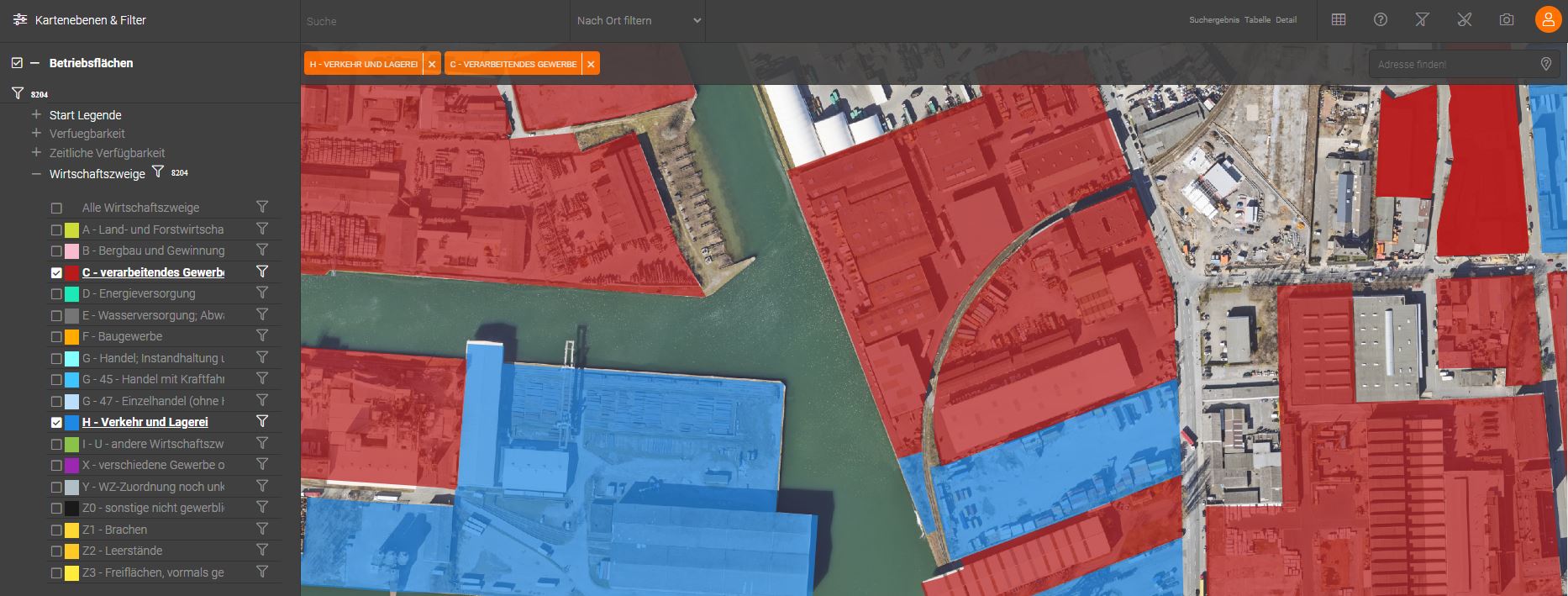 Durch Klick auf die Schaltfläche  reduziert sich die Kartenansicht auf nur diese Geometrien. Bei Auswahl von zusätzlichen Kategorien werden diese farblich entsprechend angezeigt. Wird hier ebenfalls die Schaltfläche 'Ergebnis in Karte filtern' geklickt, reduzieren sich die angezeigten Geometrien auf jene, die sämtliche Filterkriterien erfüllen.
