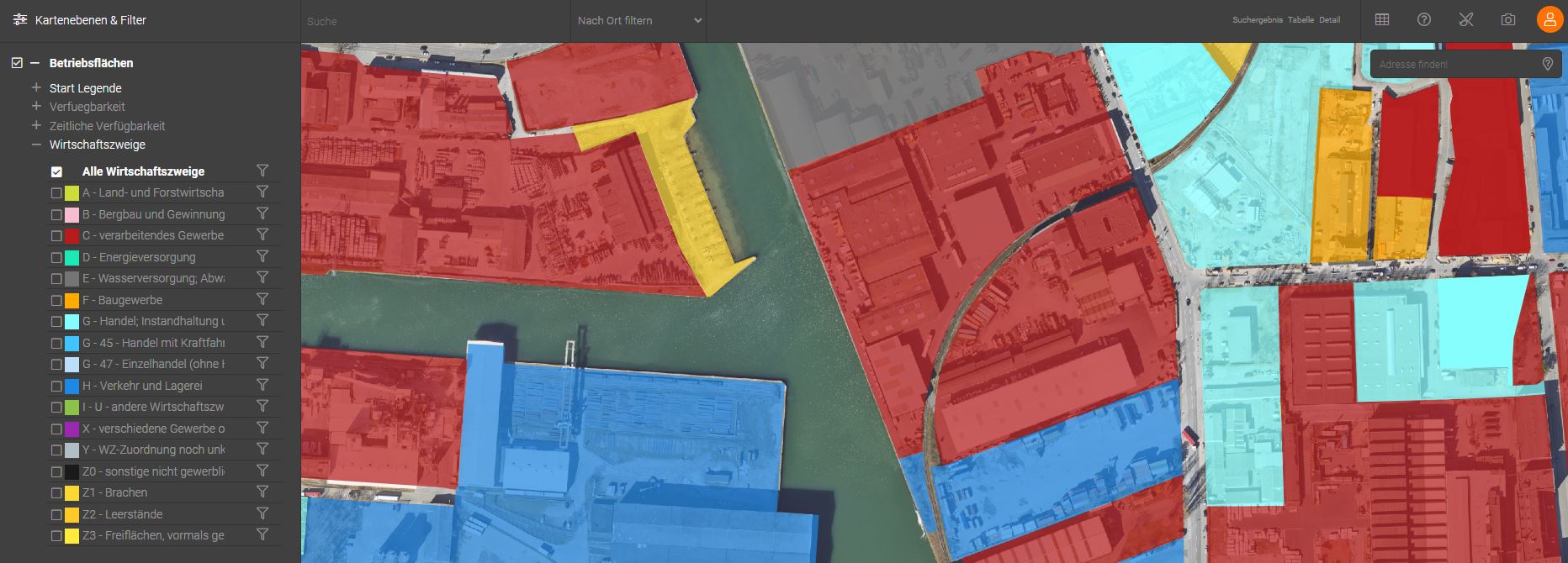 Hier haben Sie die Möglichkeit, die Fachdaten nach inhaltlichen Kategorien mit der dazugehörigen Legende in der Karte differenziert sichtbar zu schalten.