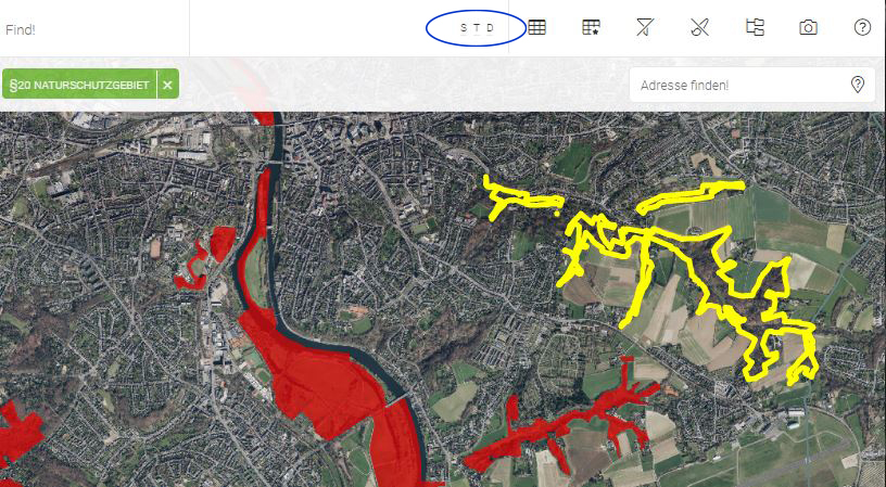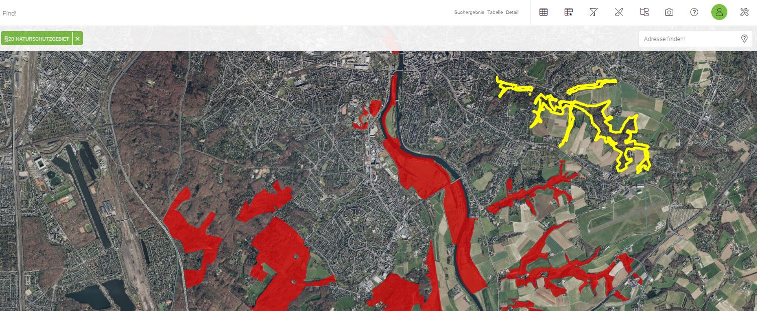 Die oben gezeigte Abbildung zeigt ein Beispiel aus der Fachanwendung Landschaftspläne der Metropole Ruhr. Es wurde in den Karteneben die Legende für Naturschutzgebiete (rote Flächen) zugewiesen und der Kartenfilter gesetzt, sodass nur diese Flächen in der Karte angezeigt werden. Eine Geometrie wurde selektiert und wird in der Karte mit gelber Umrandung dargestellt. Durch diese Bearbeitung erscheinen im Kopfbereich die zusätzlichen Schaltflächen Selektionstabelle, Kartenfilter zurücksetzen und Legende zurücksetzen.